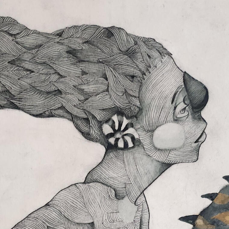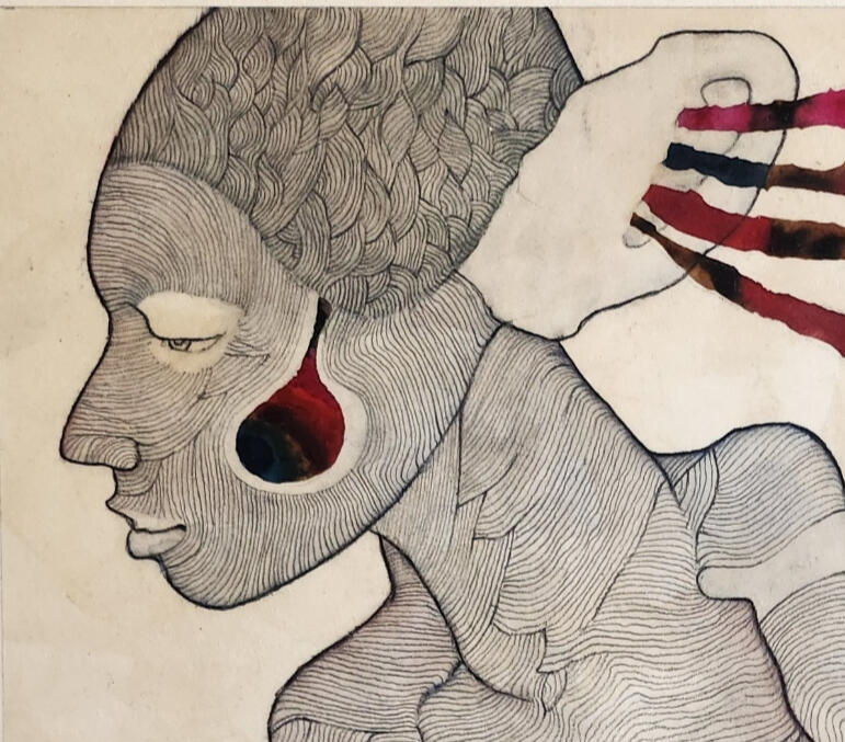 The Ribboned man,2024. pencil and gouache on board 20 cm x 30 cm